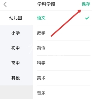 4、在学科学段选择界面,完成选择后,点击右上角保存按钮,完成年级切换。