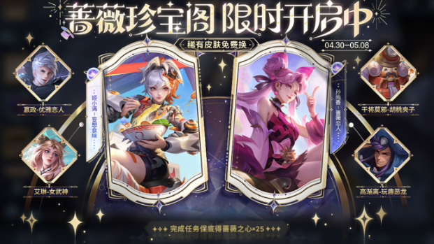 2、5月1日当天登录可直接领取蔷薇之心x4,活动期间完成累计对局、签到任务,保底会获得蔷薇之心x25。