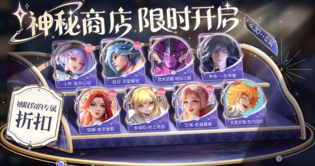 2、神秘商店限时开启,首次加入皮肤:小乔-音你心动、赵云-淬星耀世、貂蝉-唤灵魅影、艾琳-奇遇舞章、安琪拉-时之奇旅。