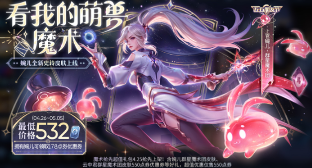 5、皮肤特权红包礼包:皮肤特权红包-群星魔术团x20,4月26日可开始使用,最晚获取时间为5月8日23:59,并于5月9日23:59过期
