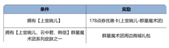 7、魔术抢先超值礼包:上官婉儿-群星魔术团皮肤x1、萌兽魔术击败特效x1、个性戳戳-萌兽魔术x10、云中君-群星魔术团皮肤550点券优惠卡x1。