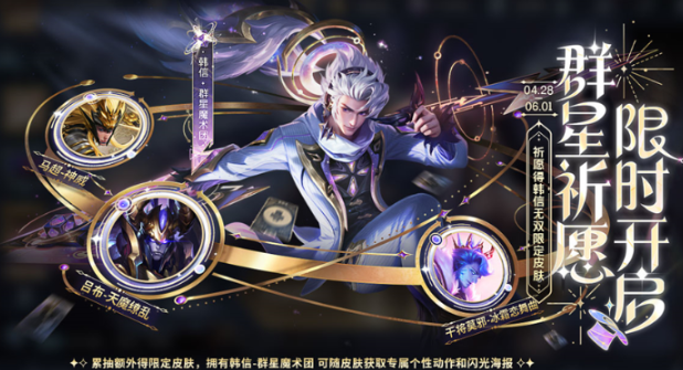 5、皮肤特权红包礼包:皮肤特权红包-群星魔术团x30,红包4月26日可开始使用,最晚获取时间为5月8日23:59,红包5月9日23:59过期。