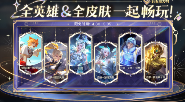 5、5月5日当天限免皮肤增加以下10款限定皮肤:刘备-百相守梦、张飞-百相守梦、关羽-百相守梦、妲己-时之奇旅、庄周-云端筑梦师、伽罗-炽翼辉光、干将莫邪-画中仙、后羿-无尽星芒、花木兰-青春决赛季、鲁班七号-乒乒小将。
