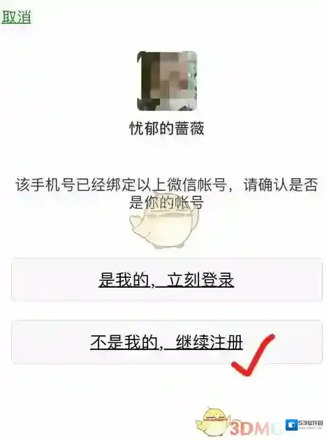 7、当手机号被其他用户绑定微信之后,会出现以下这样的界面,点击不是我的,继续注册即可。