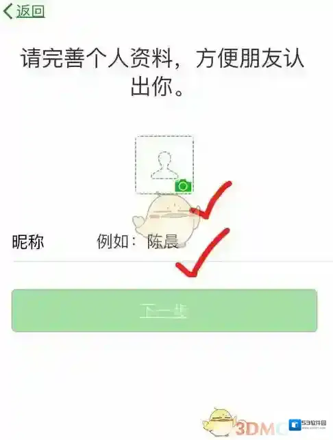 10、完善资料页面设置头像、昵称,然后点击下一步。