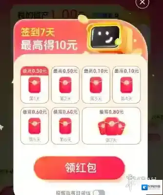 2、每日签到:只需完成每日签到就能获得对应的数额的红包奖励,累计签到7天最高可获得10元。