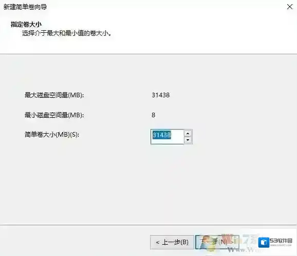 4、在下图界面给出你想划分新分区的大小,如果剩余空间较大,你可以给出小于剩余空间量的数值,剩下的空间量可以划分为其他分区;如果剩余空间不大,则数值不必修改,直接划分为一个分区