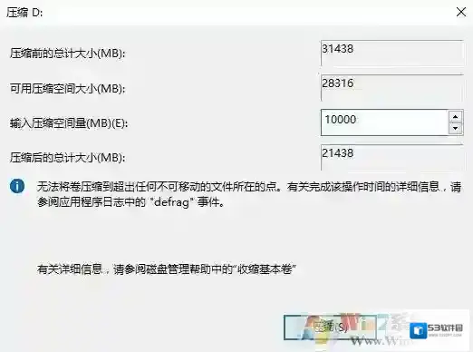 9、如果你认为现有某一个或几个分区容量过大,想把剩余空间划分为新分区,可以使用“压缩卷”功能实现(如上图),压缩空间量小于“可用压缩空间大小”即可,压缩之后会出现一个“未分配”区域,参照上述新建分区的方法就可以把压缩出来的空间划分为新分区