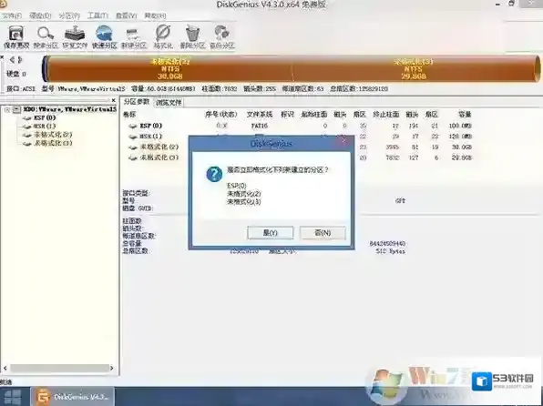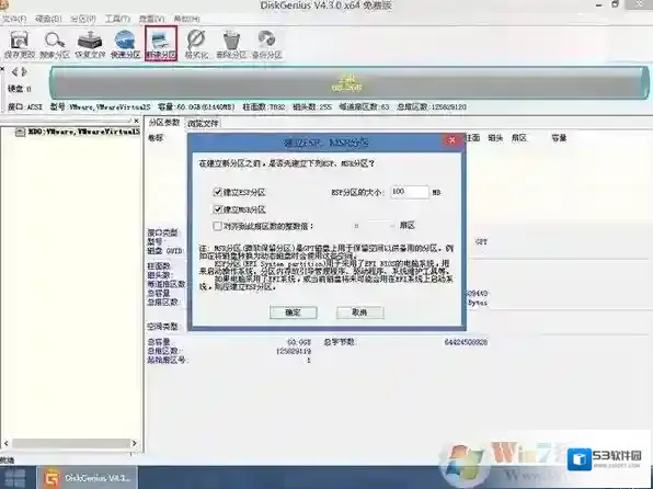 3、删掉所有已有分区后,重新建立分区会首先提示是否新建ESP和MSR分区,其中ESP分区是必须要建立的(默认100MB即可),否则Windows安装程序无法在选择安装位置后开始安装(UEFI+GPT用户直接使用安装盘分区会自动创建所需分区,不会出现影响安装的问题),如下图