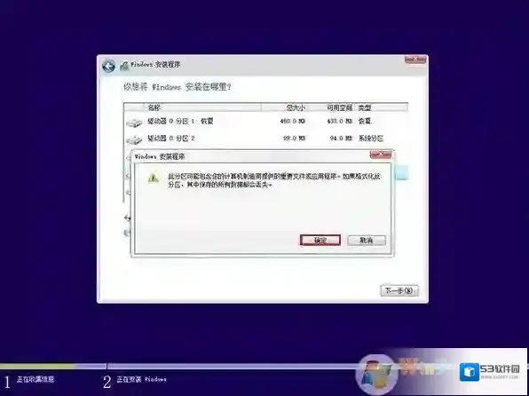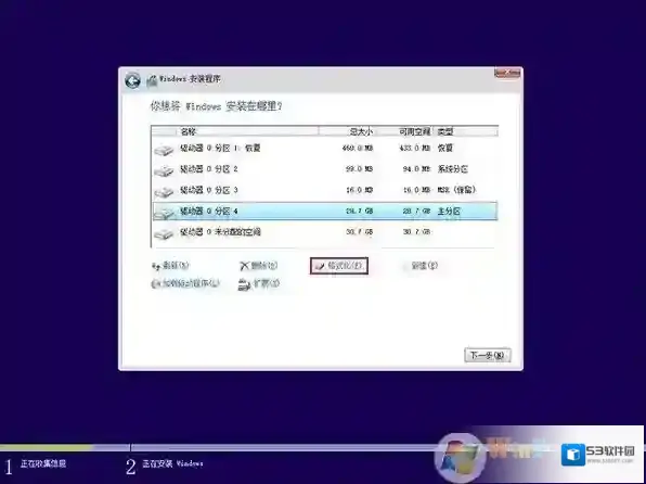 分区后可以在此格式化,也可以直接点“下一步”,系统会自动格式化选中的系统分区;其他未格式化的分区可以在系统安装结束后手动格式化