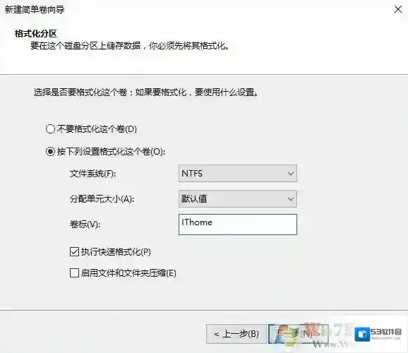 6、选择格式化方式,现有Windows系统默认NTFS格式,分配单元大小也使用默认值即可,卷标为分区名称,可自定义;下面默认执行快速格式化,保持勾选即可,如下图 :