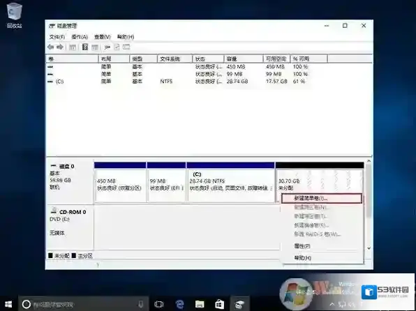3、右键单击该区域选择“新建简单卷”可将该区域分配为新分区(如上图)