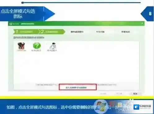 5、分析桌面图标之后,点击全屏模式勾选图标,选中你需要删除的图标,然后一步一步修复完成