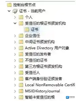 7.在左侧定位到“证书-受信任的根证书颁发机构-证书”