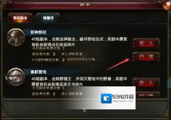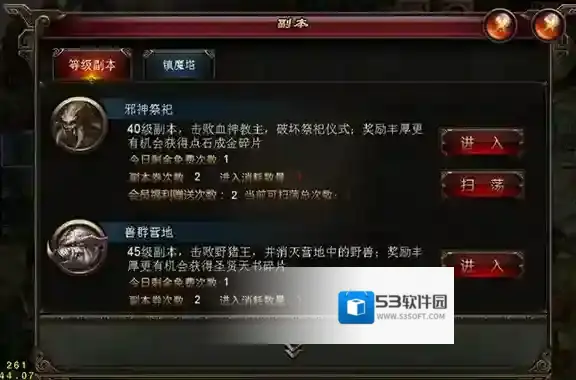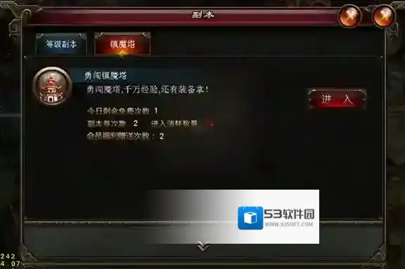 ⑤镇魔塔:前期后期主要获得经验方法之一。于副本一样,每日一次免费机会,购买副本卷轴课额外增加2次机会。开通青铜VIP可额外增加1次机会。开通黄金VIP额外赠送2次机会。