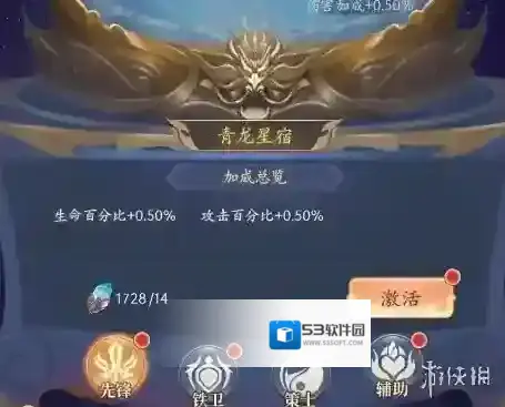 1、青龙、白虎、朱雀、玄武四个星宿台分别对应先锋铁卫、策士、辅助4个职业,星宿台激活后,可为对应职业的武将带来属性加成。
