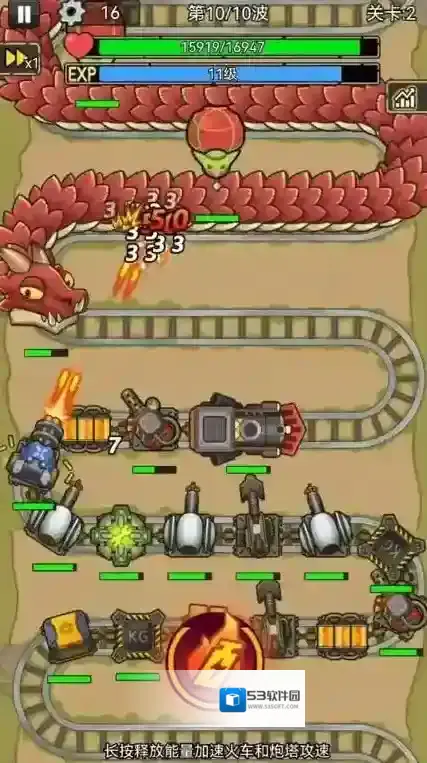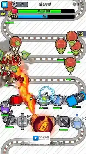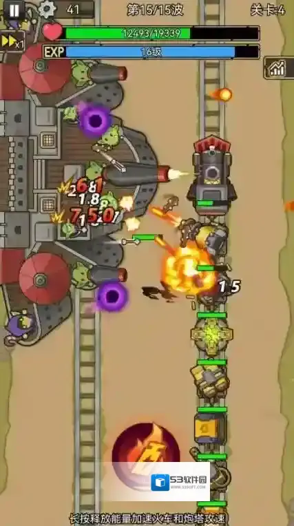 3、放好炮塔后点击开始战斗火车会自动前进,车厢上的炮塔也会自动攻击,点击屏幕中间的按钮可以加速火车和炮塔攻速。