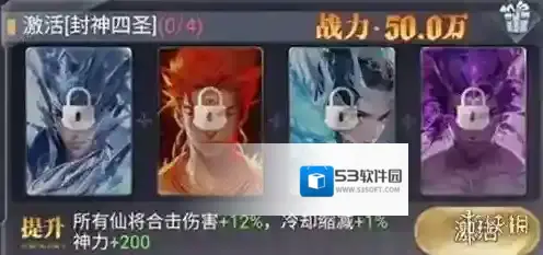 战力:500000、提升:所有仙将合击伤害+12%,冷却缩减+1%,神力+200。