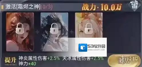 战力:100000、提升:神炎属性伤害+2.5%,天冰属性伤害+2.5%,神力+40。