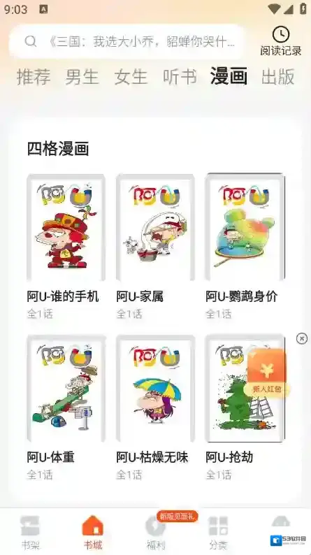 2、“书城”页面为用户推荐了很多的热门小说资源。
