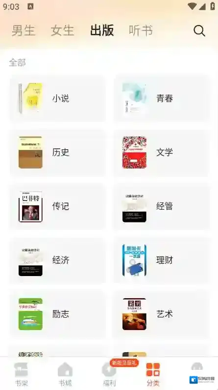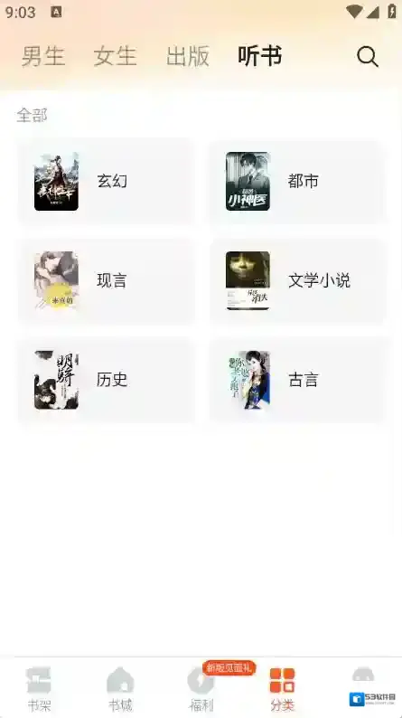 3、分类页面将小说进行了归类,言情、武侠以及都市等类型。