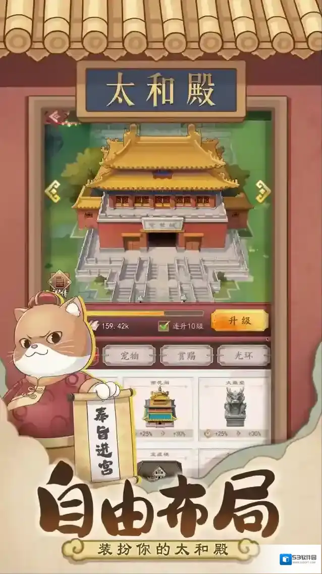 游戏内联动玩法限时上线,东家们不仅能在游戏中一览完美还原的太和殿等深宫场景,还能穿上同款精美宫廷服饰,和宫中的御猫一起奉旨行好事!